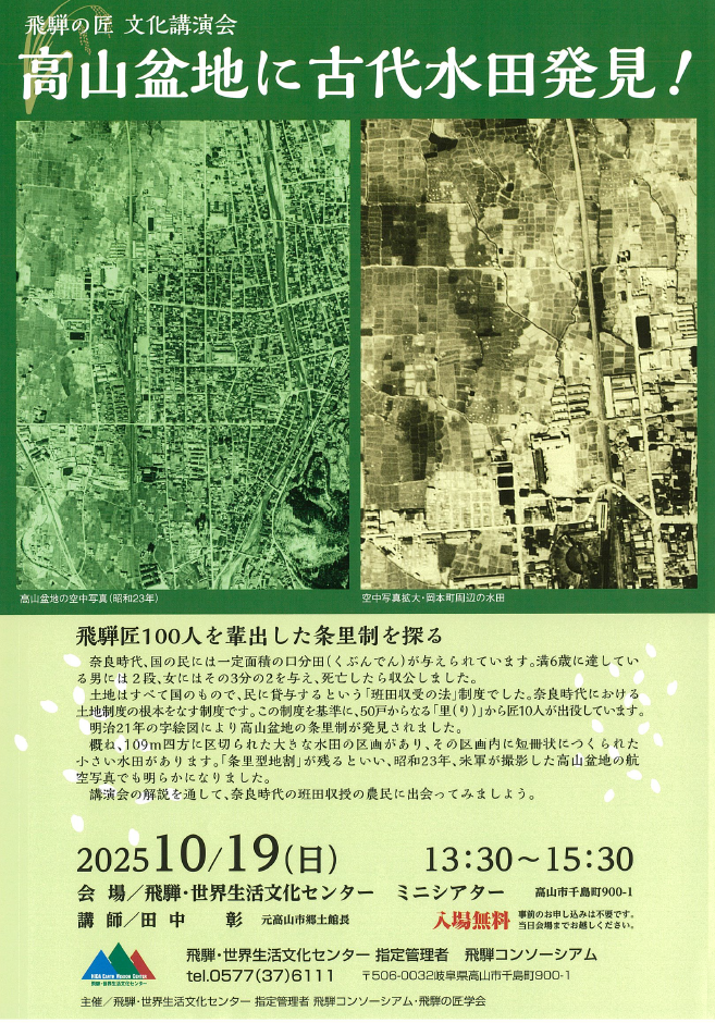 飛騨・世界生活文化センターよりお知らせです。 『高山盆地に古代水田発見!!!』 ~飛騨匠100人を輩出した条里制を探る~…