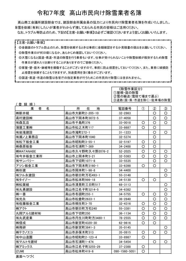 高山商工会議所建設部会では、建設部会所属会員の協力により市民向け除雪業者名簿を作成いたしました。 除雪を依頼(有料)したいが業者が…