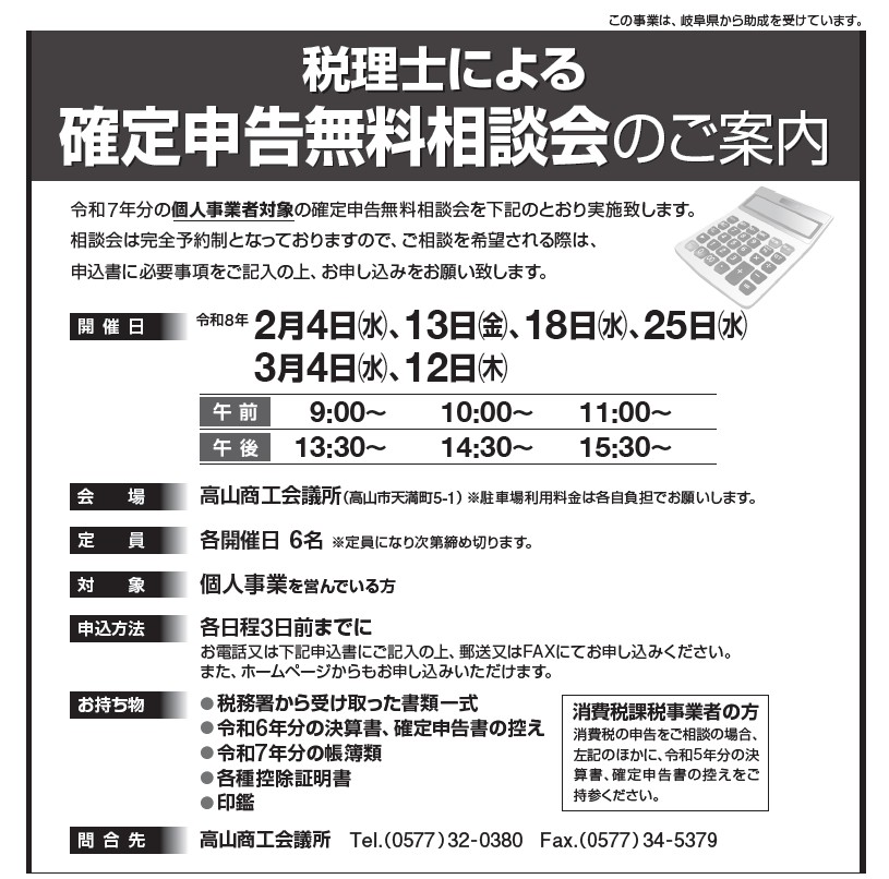 令和7年分の個人事業者対象の確定申告無料相談会を実施しています。 申込書に必要事項をご記入の上、お申し込みをお願い致します。…