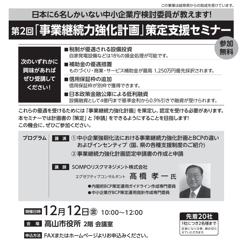 本セミナーでは、事業継続力強化計画の策定から国の認定制度の申請書策定までを完結することを目指すセミナーとなります。 セミナー中にコ…