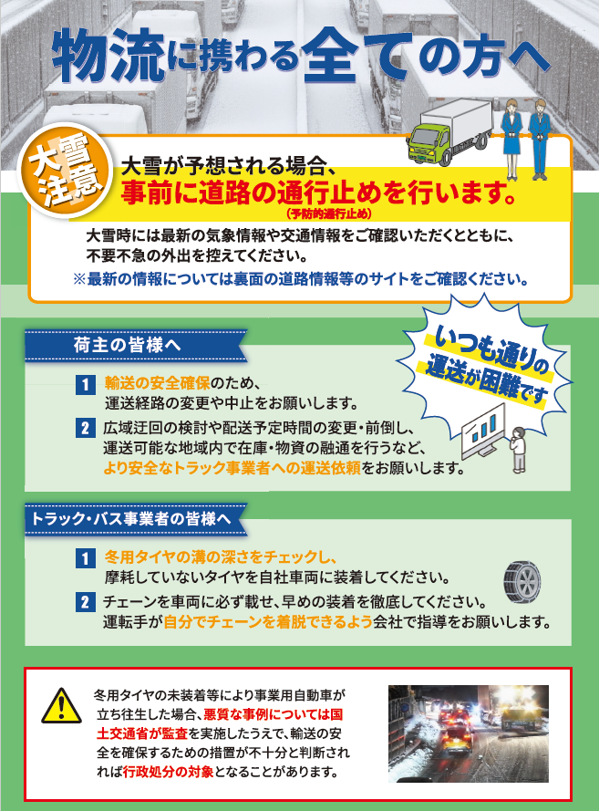 岐阜国道事務所よりお知らせです。 物流に携わる全ての方へ ~大雪が予想される場合、事前に道路の通行止めを行います~…
