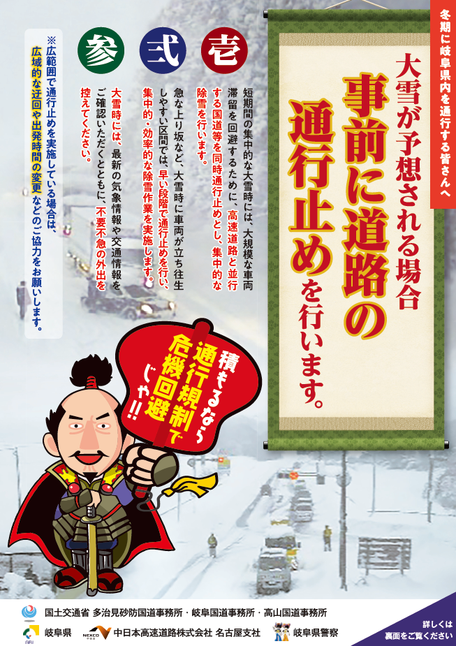 岐阜国道事務所よりお知らせです。 冬期に岐阜県内を通行する皆さんへ ~大雪が予想される場合、『事前に道路の通行止め』を行いま…