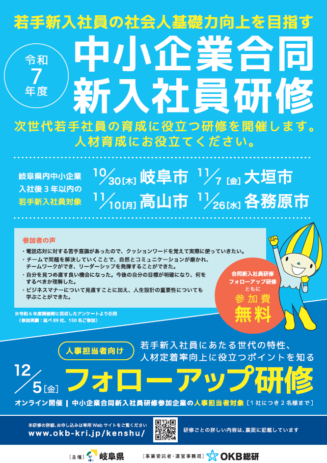 OKB総研よりお知らせです。 ~若手新入社員の社会人基礎力向上を目指す~ 『 中小企業合同新入社員研修…