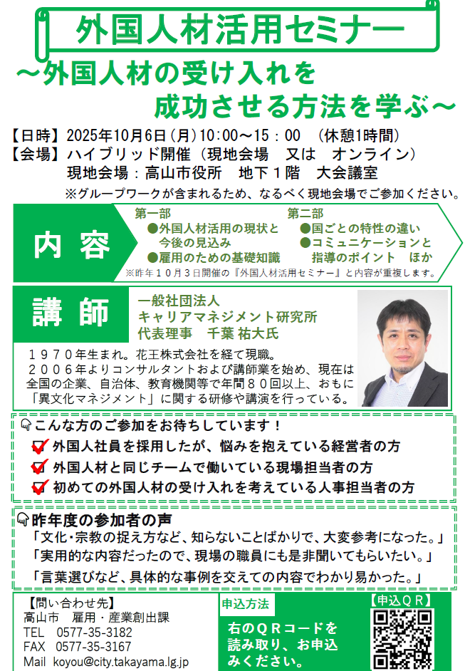 高山市からのお知らせです。 【 外国人材活用セミナー 】 『外国人材の受け入れを成功させる方法を学ぶ』 下記のような方…