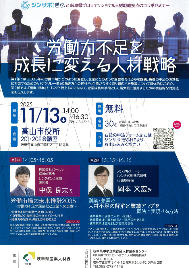 岐阜県からのお知らせです。 ~「ジンサポ!ぎふ」と「岐阜県プロフェッショナル人材戦略拠点」のコラボセミナー~ 第1部では…
