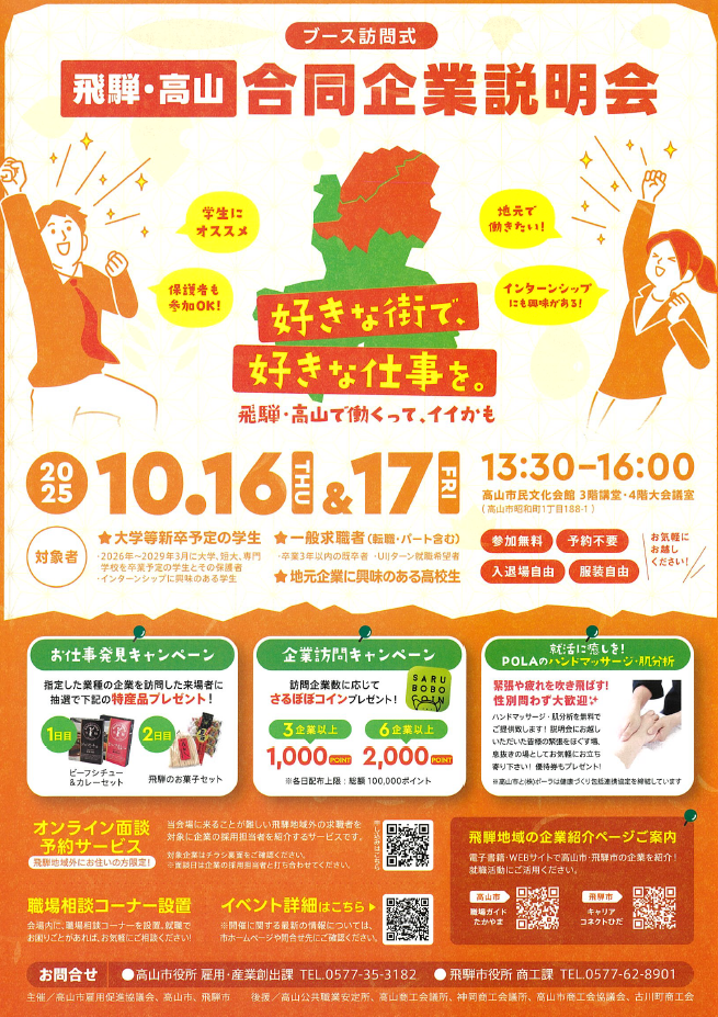 高山市雇用促進協議会よりお知らせです。 高山市民文化会館にて、飛騨高山合同企業説明会を2日間、開催いたします! ☆参加無料・…