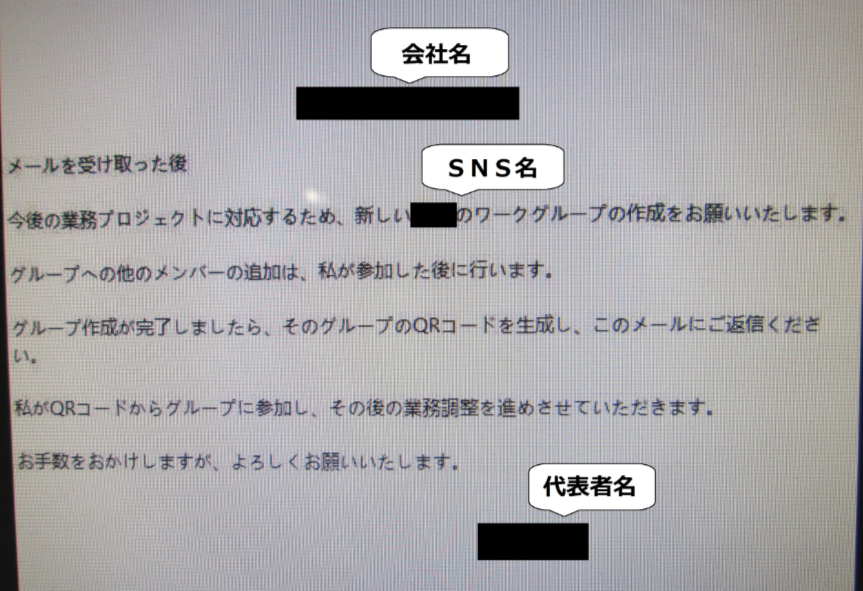 SNSグループを作るように指示し、振込権限を持っている担当者をグループ内に招待させる。